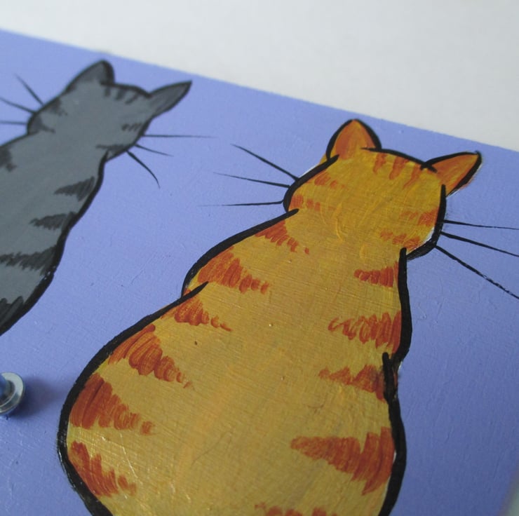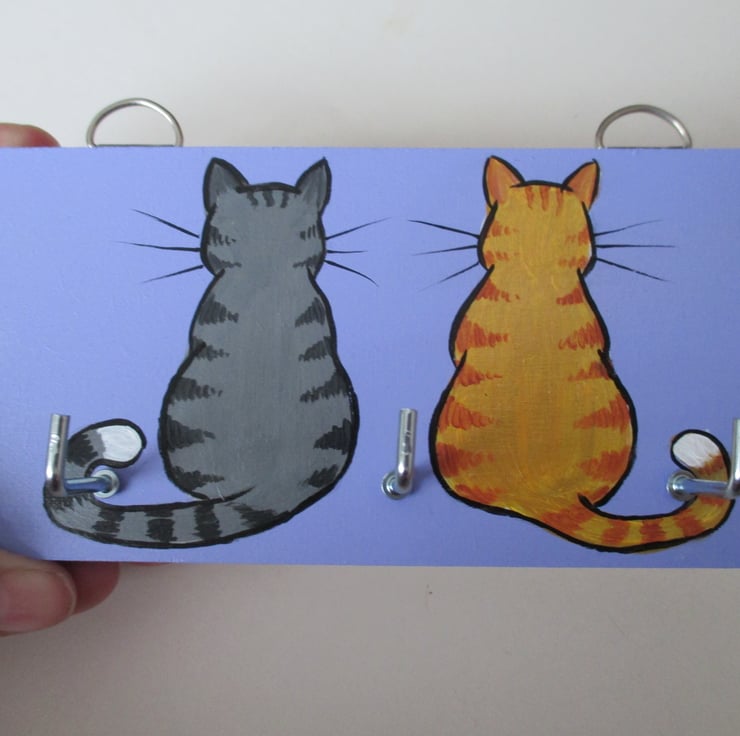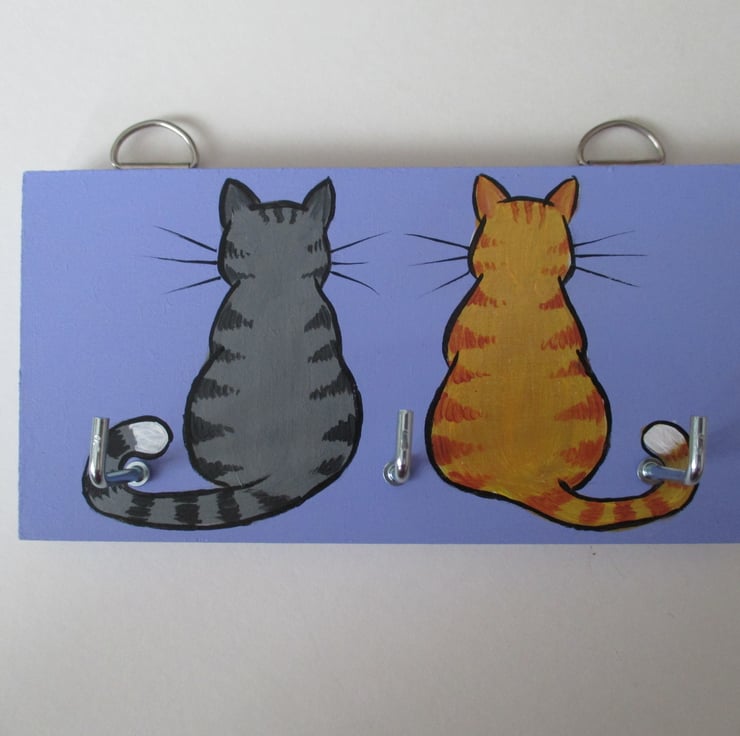 This is a hand painted wooden key rack / holder featuring two cats, one grey, one ginger. It is hand painted in acrylics.