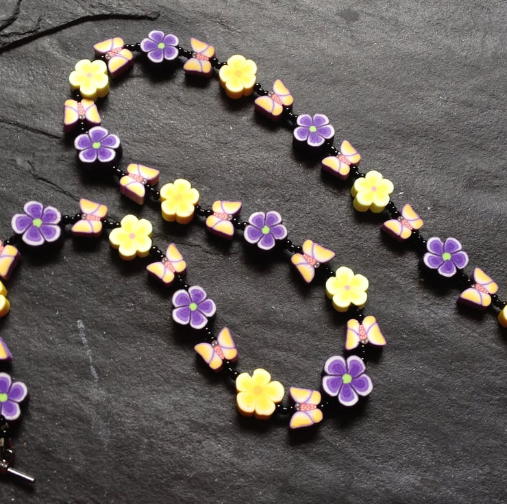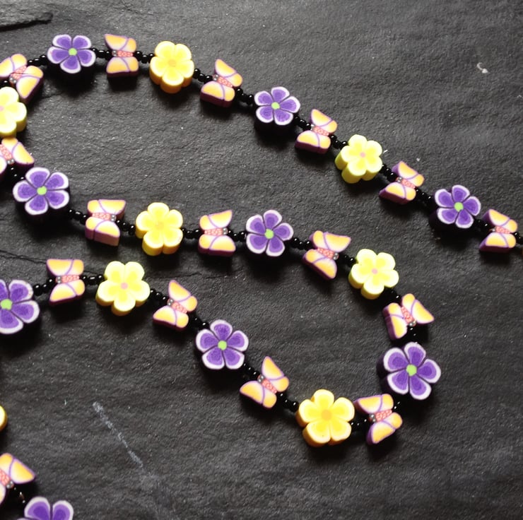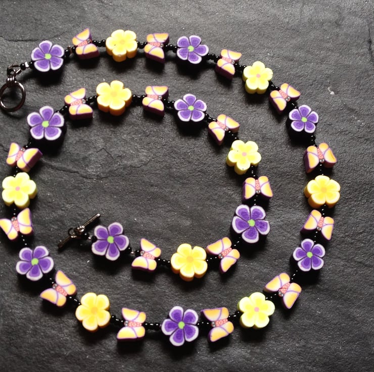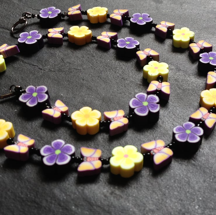 A beautiful array of lilac and yellow polymer clay butterflies mingle with sunny yellow, lemon and purple flowers in this crocus inspired spring necklace.
