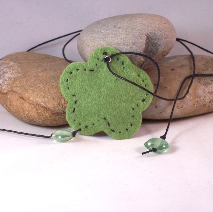 Felt backing, handstitched onto cotton yarn cord - this is fixed with a slip knot, so it can be adjusted to your own preferred length. Glass beads are used at the cord ends.