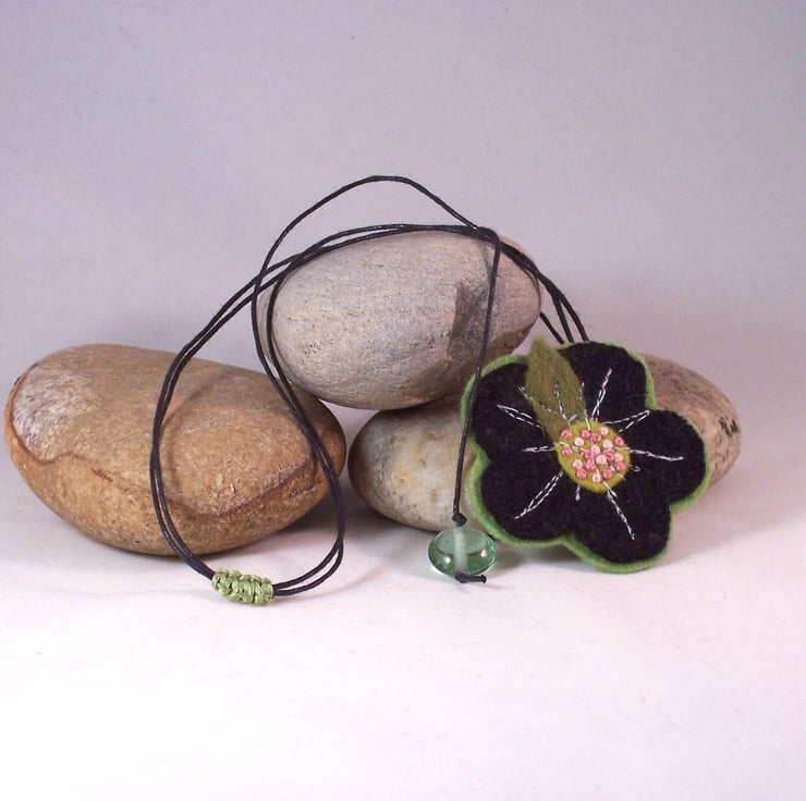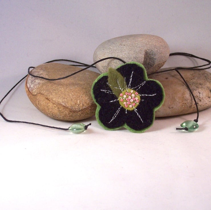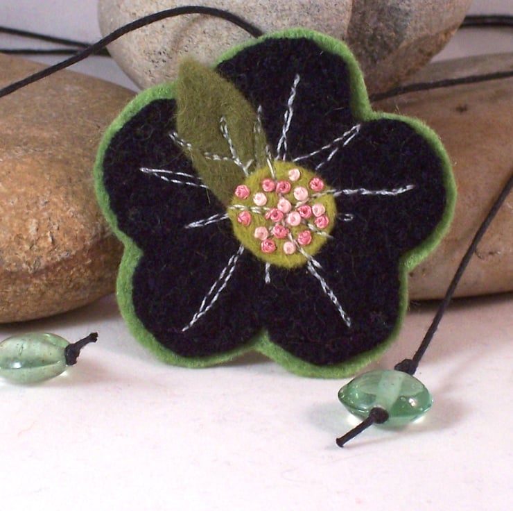 Midnight blue recycled cashmere with felt in light and dark olive green. Hand embroidered with pale pink and rose pink french knots.