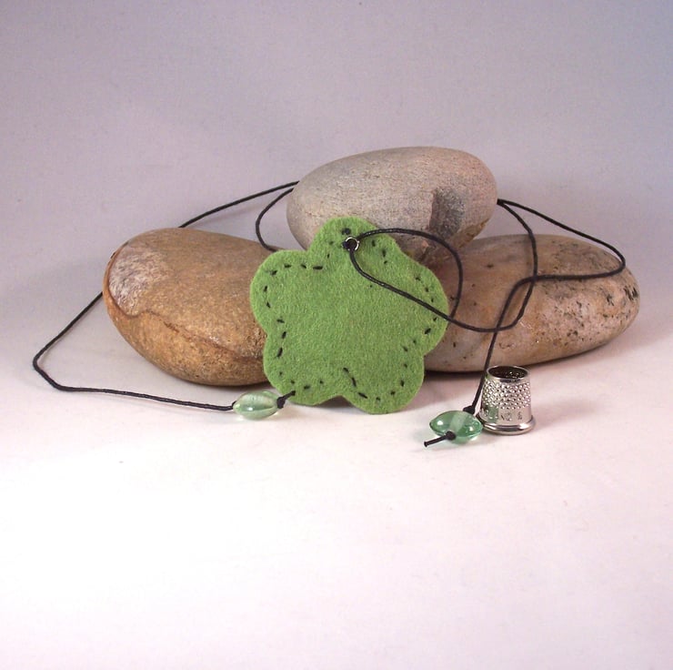 Felt backing, handstitched onto cotton yarn cord - this is fixed with a slip knot, so it can be adjusted to your own preferred length. Glass beads are used at the cord ends.
