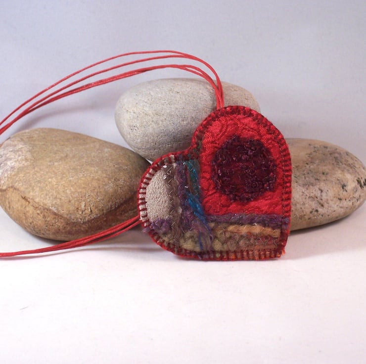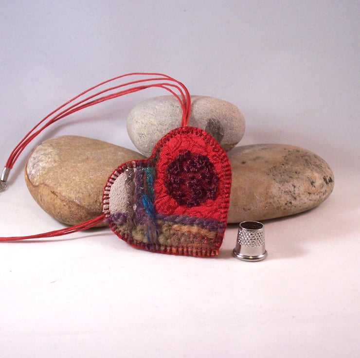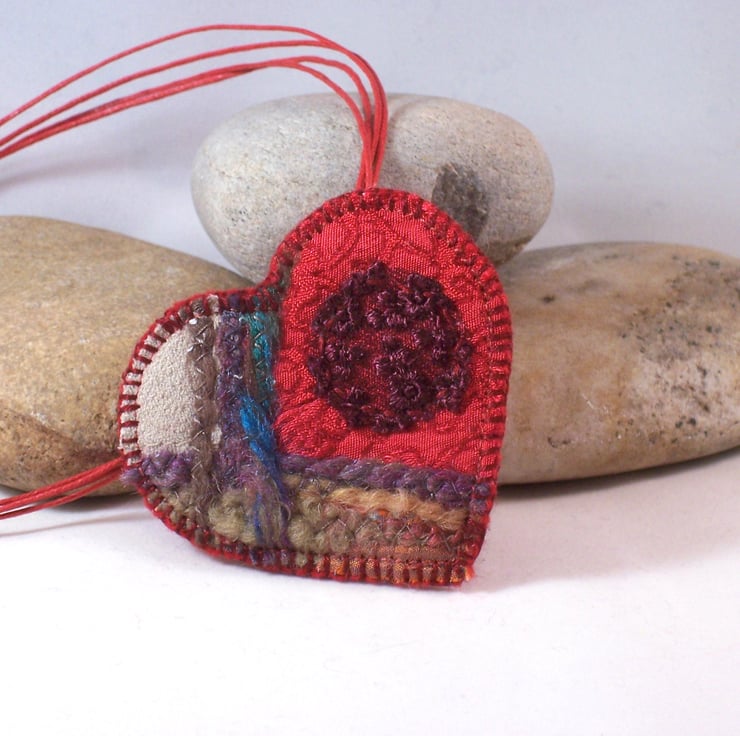 Mixed fabric textile pendant with machine embroidery and hand embroidery.