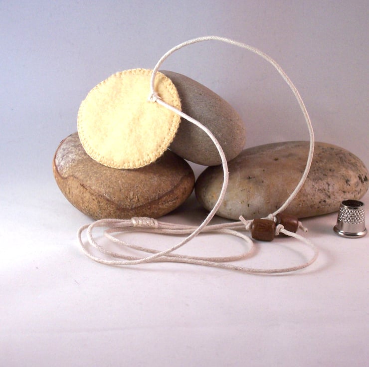 Felt backing, handstitched onto waxed cotton cord with slip knot fastening (which just loops over your head) and vintage wooden buttons. Pull cord ends to bring necklace to the length you want.