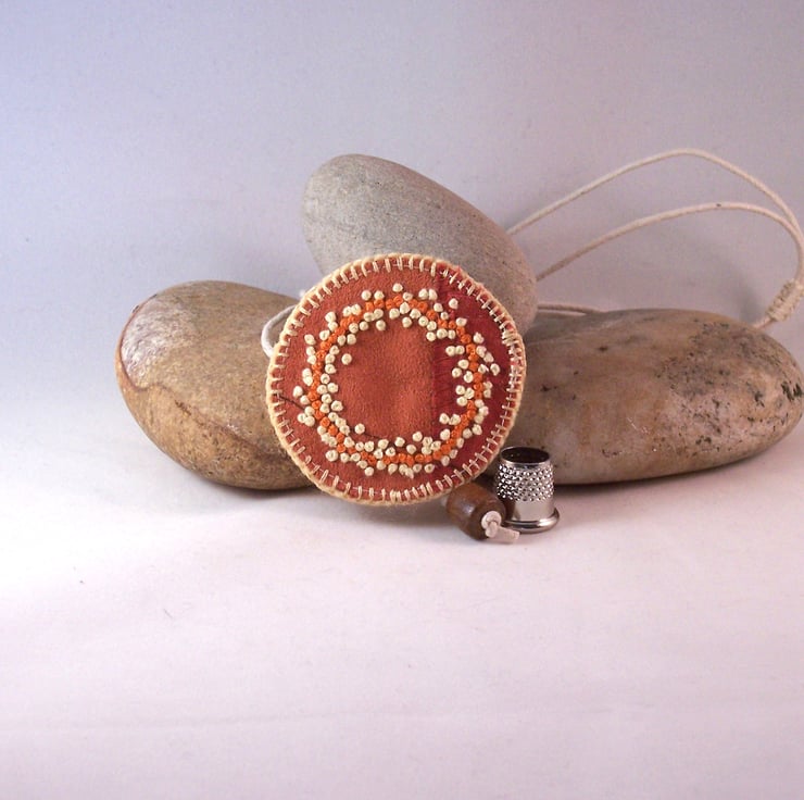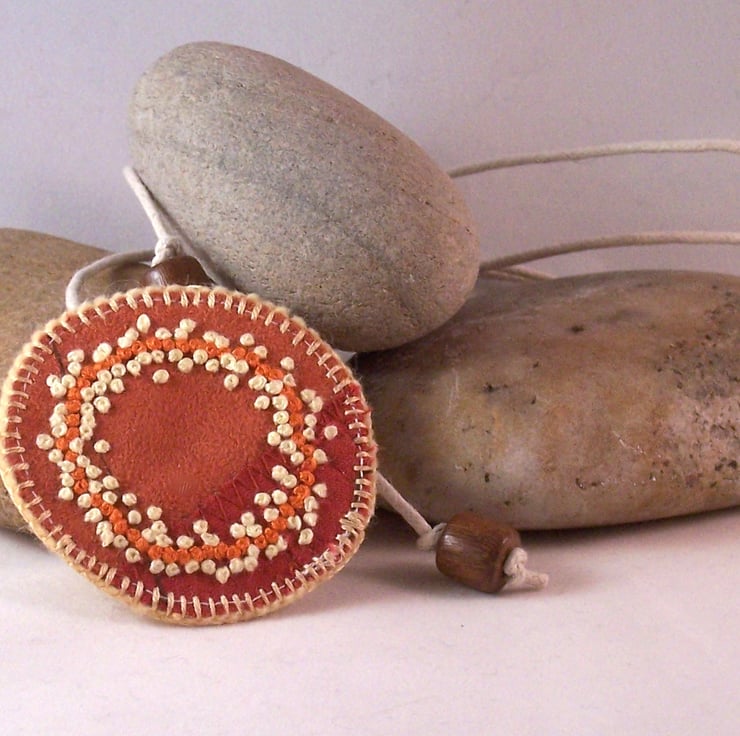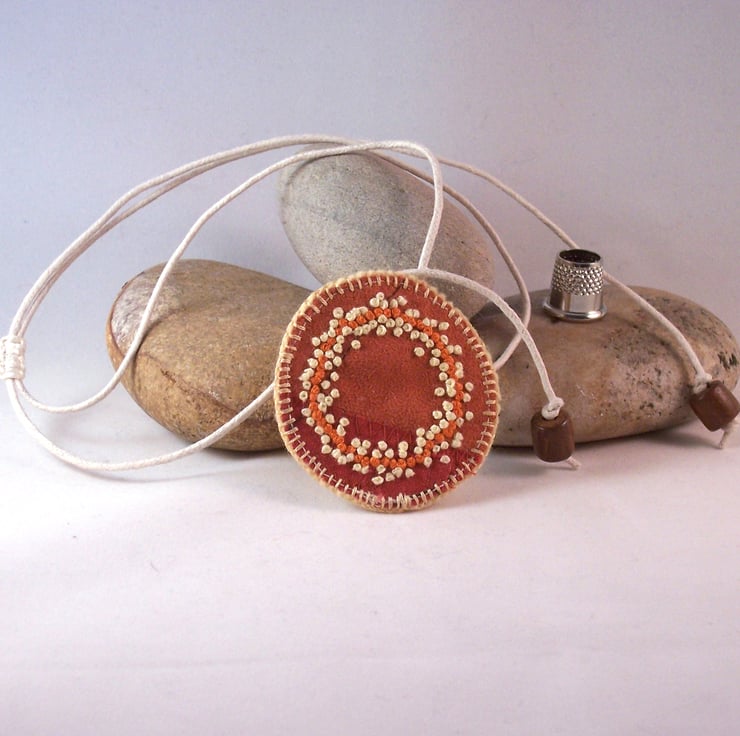 Mixed fabric textile pendant with machine embroidery and hand embroidery.
