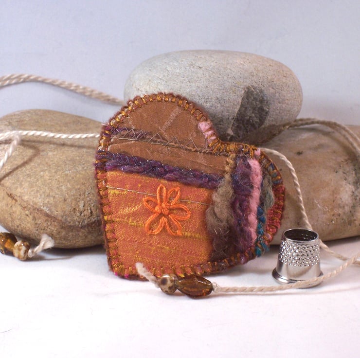 Amber is a mixed fabric textile pendant with machine embroidery and hand embroidery in gorgeous autumnal shades of peach, bronze and browns.