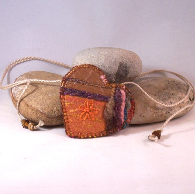 Amber is a mixed fabric textile pendant with machine embroidery and hand embroidery in gorgeous autumnal shades of peach, bronze and browns.
