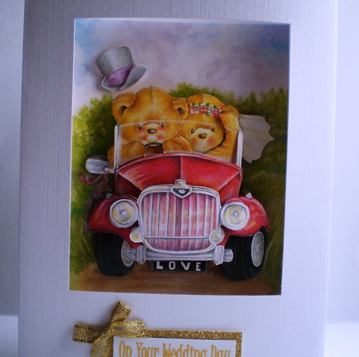 A bride and groom teddy in their wedding car are on a white card with an oblong aperture. The card measures 150x203mm (6x8in). The greeting is mounted on gold glitter board and have added a gold bow to match and a little gold heart in corner. Insert is white with hearts punched in corner and there is a wedding verse. Please let me know if you would like this personalised