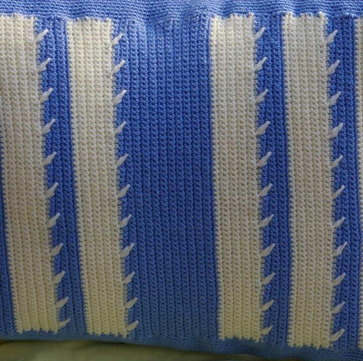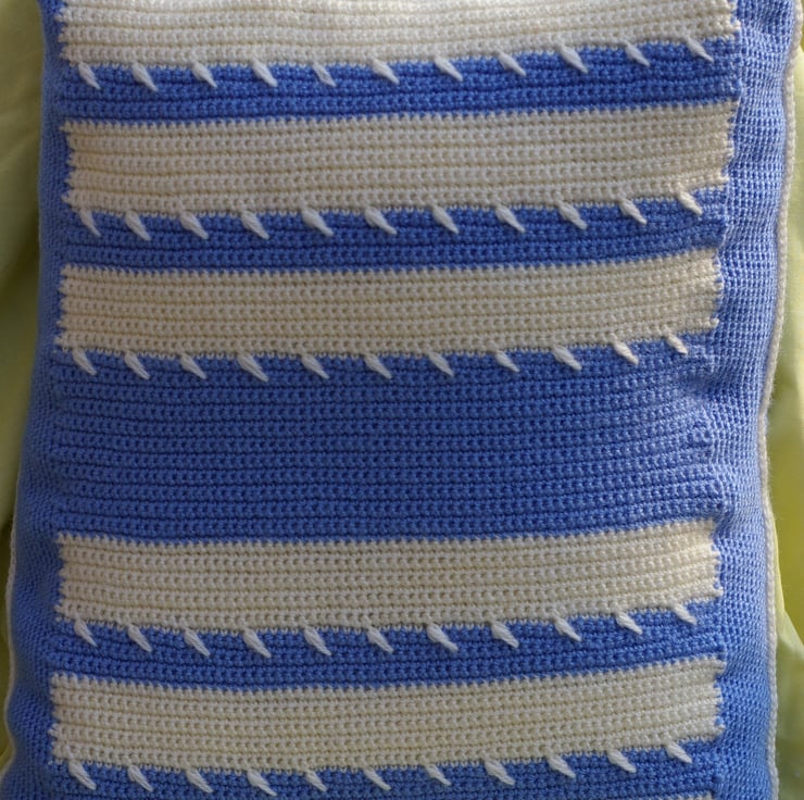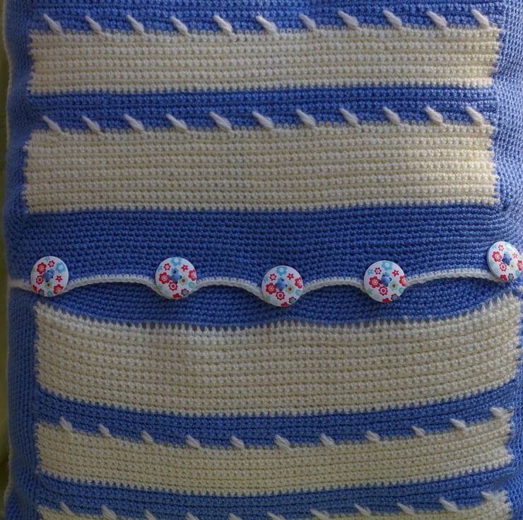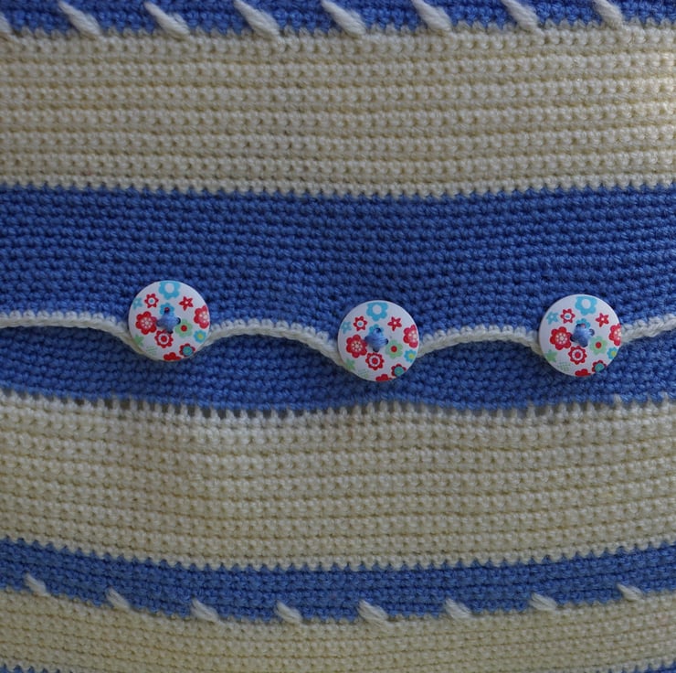 A large plump crochet cushion made with 100% acrylic yarn. The cushion is a blue and white striped design with my own variation of the ‘feather stitch. The cushion is in the form of an envelope. It fastens on the reverse side with five blue and red flowers on white printed wooden buttons.