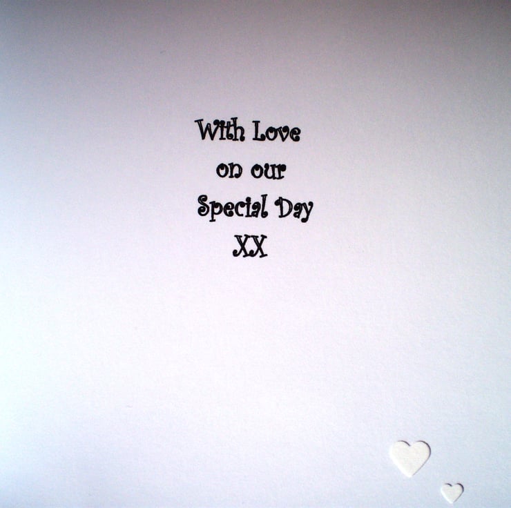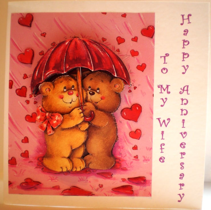A square white card measuring approximately 144x144mm (5.5x5.5in) has two teddies sharing an umbrella . The image is decoupage /3D effect. Insert is white with a greeting and there are hearts punched in corner. I have made this for a wife but can make it for anyone