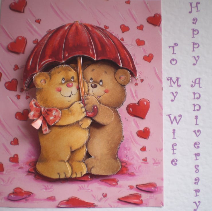 A square white card measuring approximately 144x144mm (5.5x5.5in) has two teddies sharing an umbrella . The image is decoupage /3D effect. Insert is white with a greeting and there are hearts punched in corner. I have made this for a wife but can make it for anyone