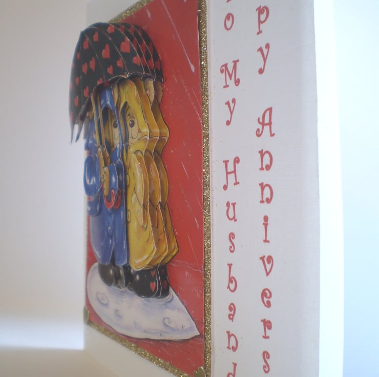 A square white card measuring 144x144mm (5.5x5.5in) has a decoupage/ 3D effect image of two teddies sheltering under an umbrella from the rain. I have used gold glitter board to mount the image and have placed little gold hearts in the corners. Insert is white with hearts punched in corner and there are a few words. I have made this for a husband but can make it for anyone, just let me know the details.