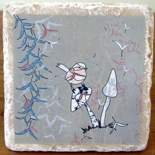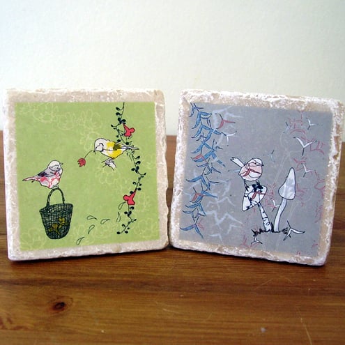A pair of natural stone coasters each decorated with an original littlebirdy design.