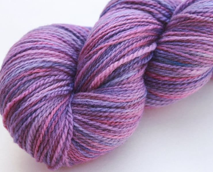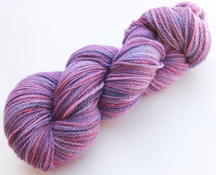 Gentle shades of pink, mauve and lavender. This is a big, squashy, soft skein of two-ply merino sport/sock yarn - despite its huge appearance it works up as a thick-ish sock yarn. (Photographs have been taken and edited in bright natural light.)