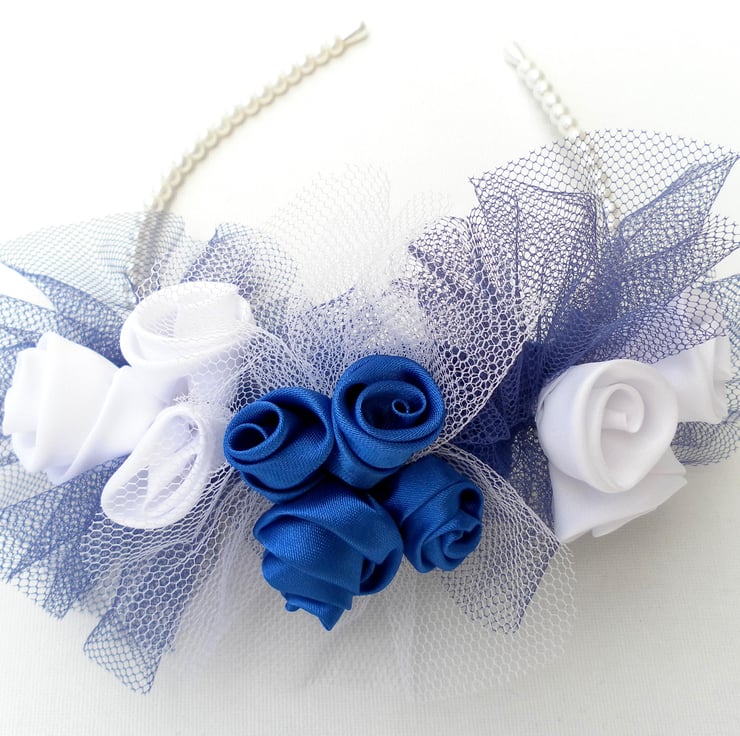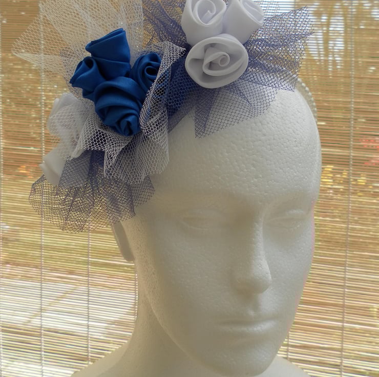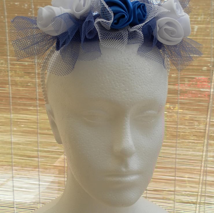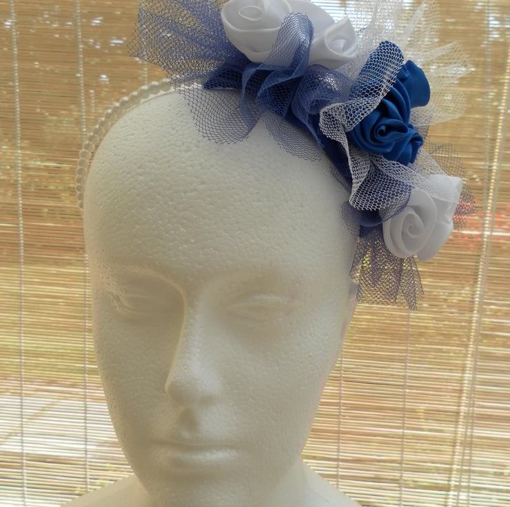 Beautiful, keepsake, flower hair accessory in blue and white. It is a one off and would be unique to you. Ten handmade, fabric roses, nestle on white and blue net, sewn to matching blue felt. This hair accessory can be worn on the pearly headband provided, on the side or top of the head or removed from the headband and pinned to the hair, with or without a veil. 18cm x 6cm approx. Please see matching bouquet in my shop.
