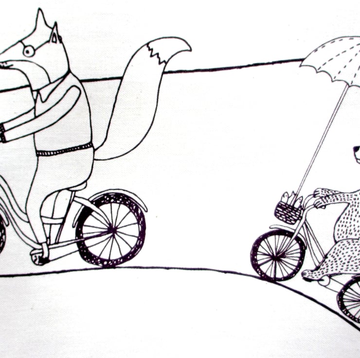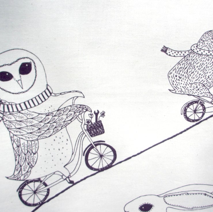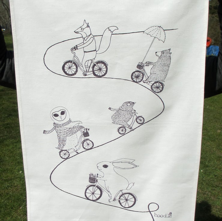 This Tea towel is made from organic cotton, and is hand made in the UK. Hand screen printed with water based inks. This is a perfect gift for any bike and animal loving person.