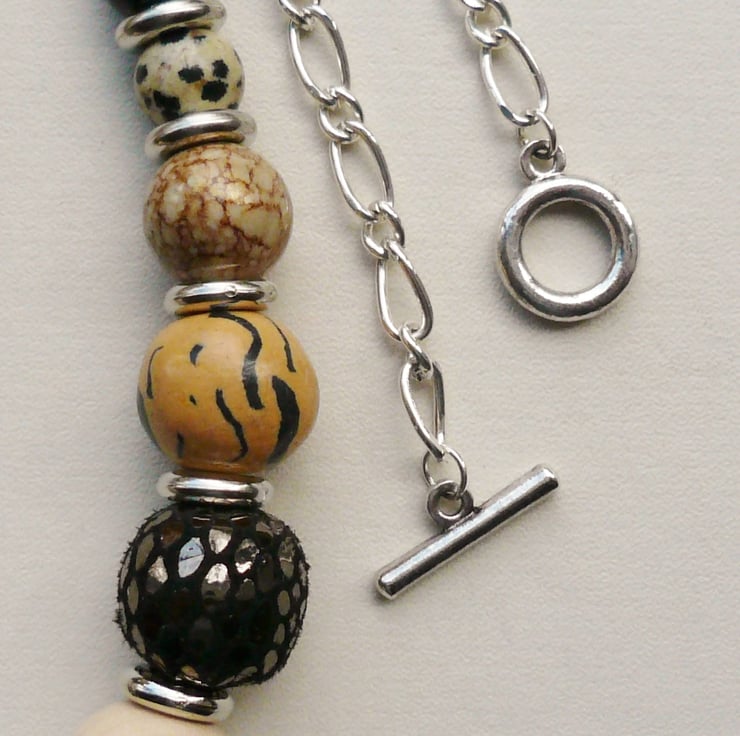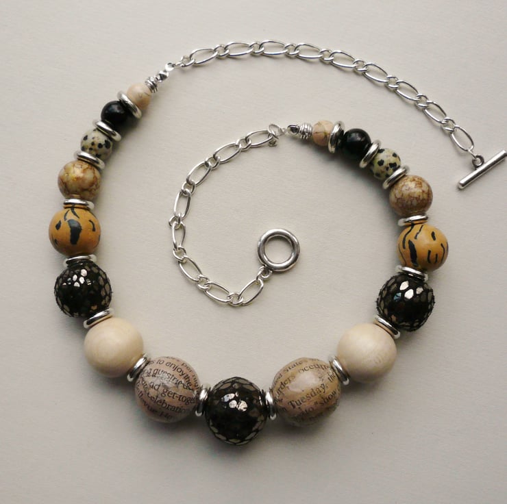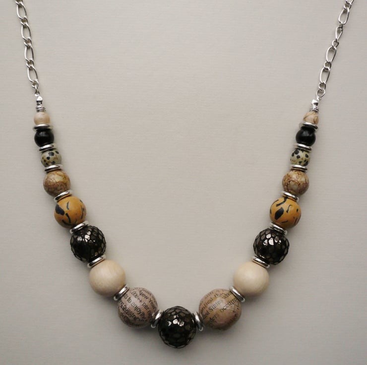 This chunky necklace is made up of a series of beads in decreasing sizes of black leather covered, newsprint covered, plain wooden, handmade polymer clay tiger striped, resin marble-effect, spotted dalmation jasper and black and tan glass. Largest central black bead is 20mm wide. Silver coloured ring spacers separate each bead. Finished off with silver plated chain and toggle clasp. Total length incl clasp is approx 52cm.