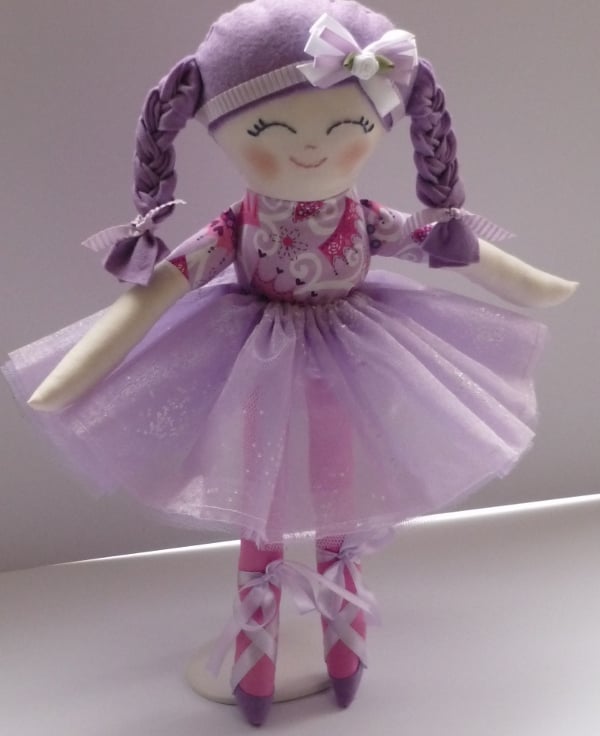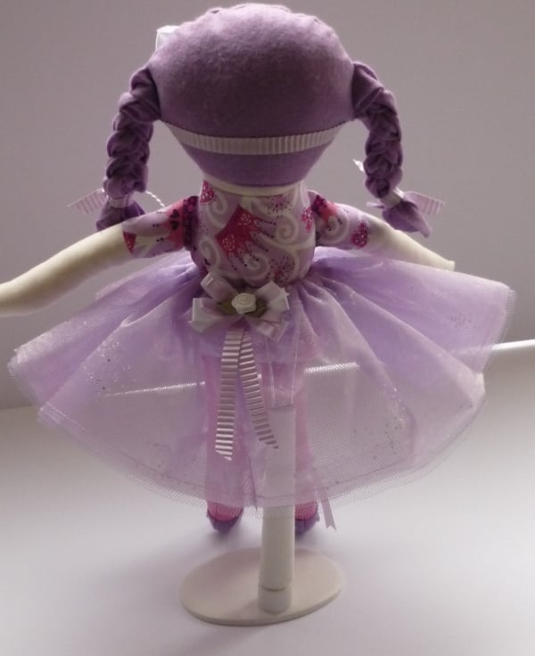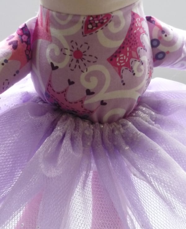 Doll wears a leotard made from a purple cotton fabric with crowns. Her tutu is made from lilac netting with a top layer of lilac organza decorated with crystals. Her shoes are made of felt and she wears a headband with a flower. The back of her tutu is decorated with a matching flower.