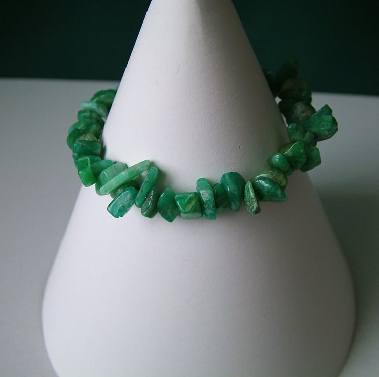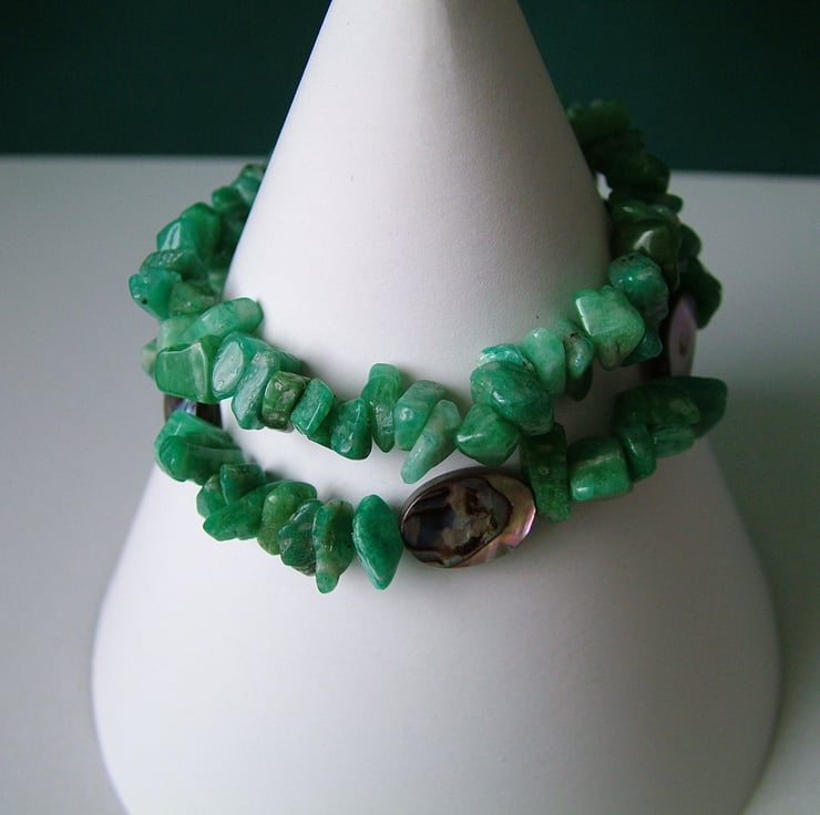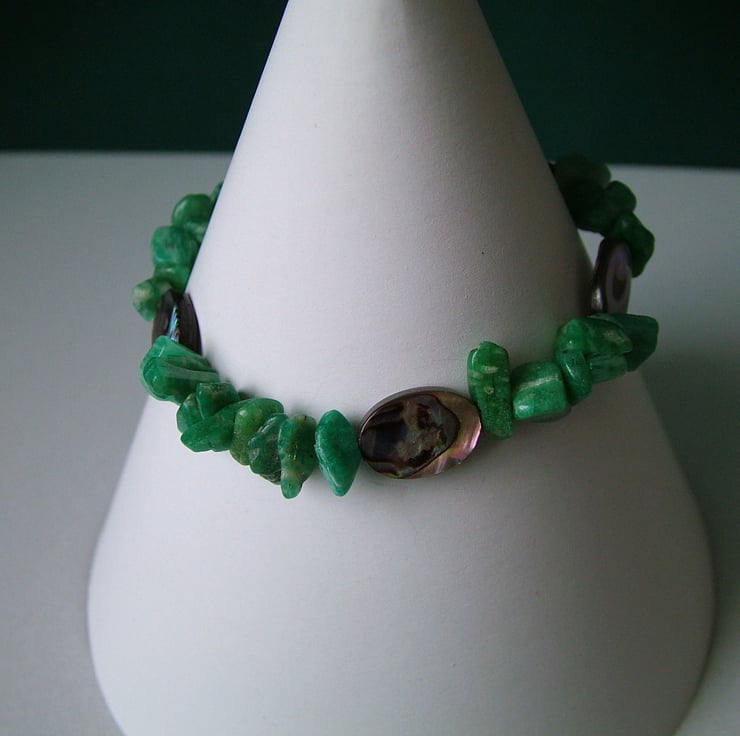 It has been made with 14mm abalone ovals and amazonite nugget chips. These have been strung onto jewellery elastic and will fit most wrist sizes.