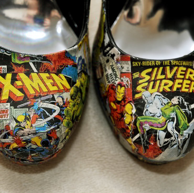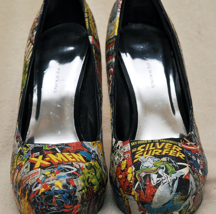This listing is for me to take your shoes and decoupage them with this amazing marvel superhero paper. It's perfect for shoes that are aesthetically damaged as it will all get covered up!
