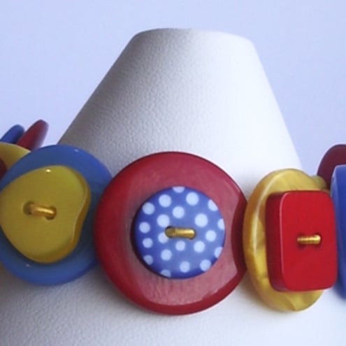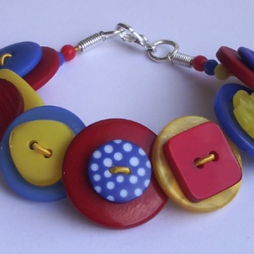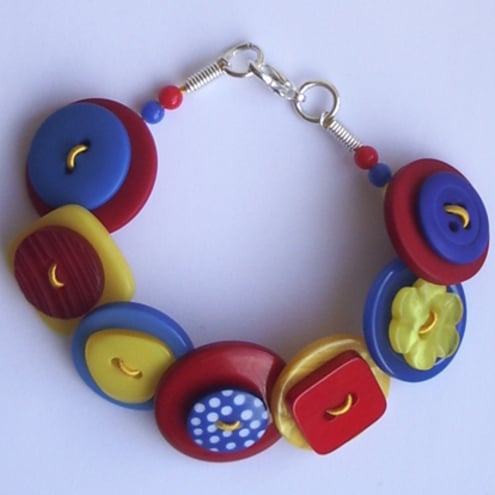This distinctive button bracelet is rich with an assortment of red, yellow and blue buttons. These are threaded onto jewellery wire, which secures at the end with a silver plated lobster clasp fastener.