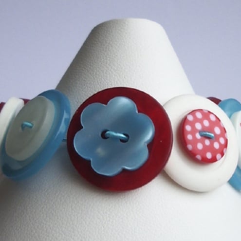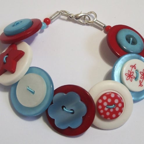 This distinctive button bracelet is rich with an assortment of red, white and aqua buttons. These are threaded onto jewellery wire, which secures at the end with a silver plated lobster clasp fastener.