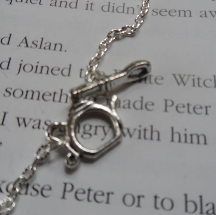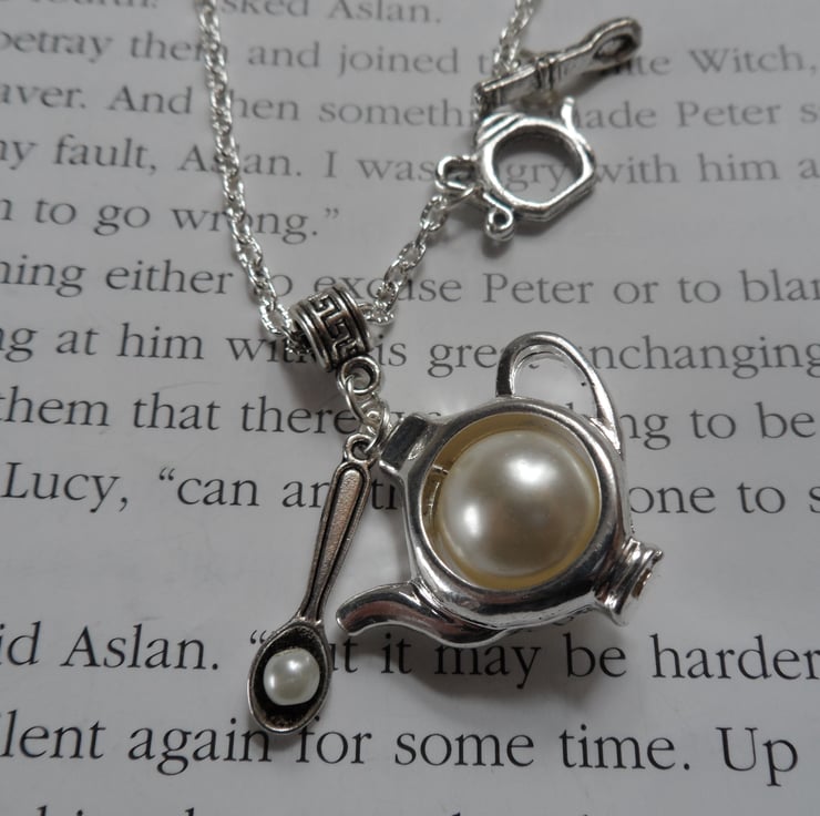 This cute whimsical little necklace has a cute little silver teapot charm with a cream pearl in the middle.It has a matching cute spoon with a teapot and spoon toggle fastener.