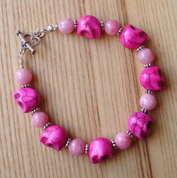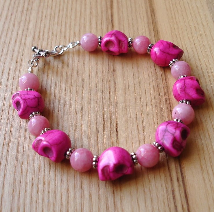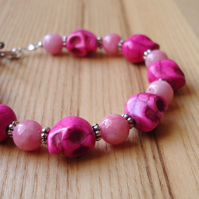 This fun bracelet features some sweet pink howlite skull beads. They are combined with mottled soft pink glass beads and tibetan silver beads. Perfect for anyone with a spooky side.