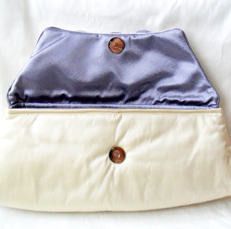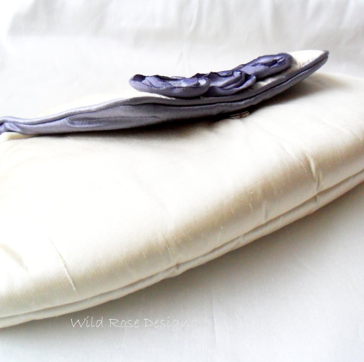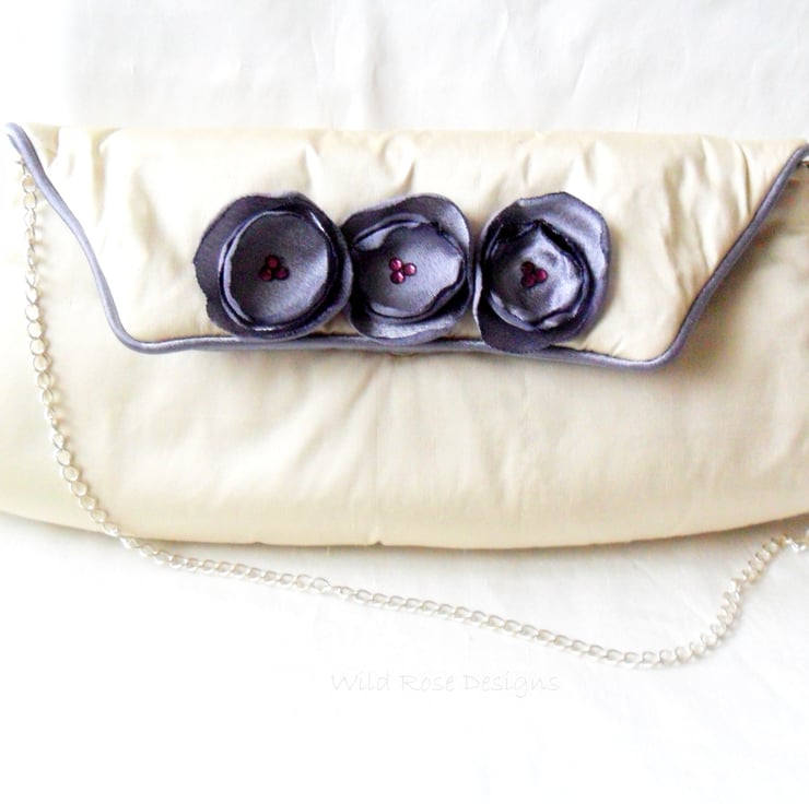 A beautiful handmade 'Occasion' Bag in Ivory Silk Dupion. The flap, which closes with a magnetic snap, is edged in lilac satin piping and is decorated with lilac satin 'flowers' with amethyst coloured diamantes. The bag is lined in the same lilac satin and has a divided slip pocket. It comes with a detachable silver coloured chain which is approximately 50 cm long.