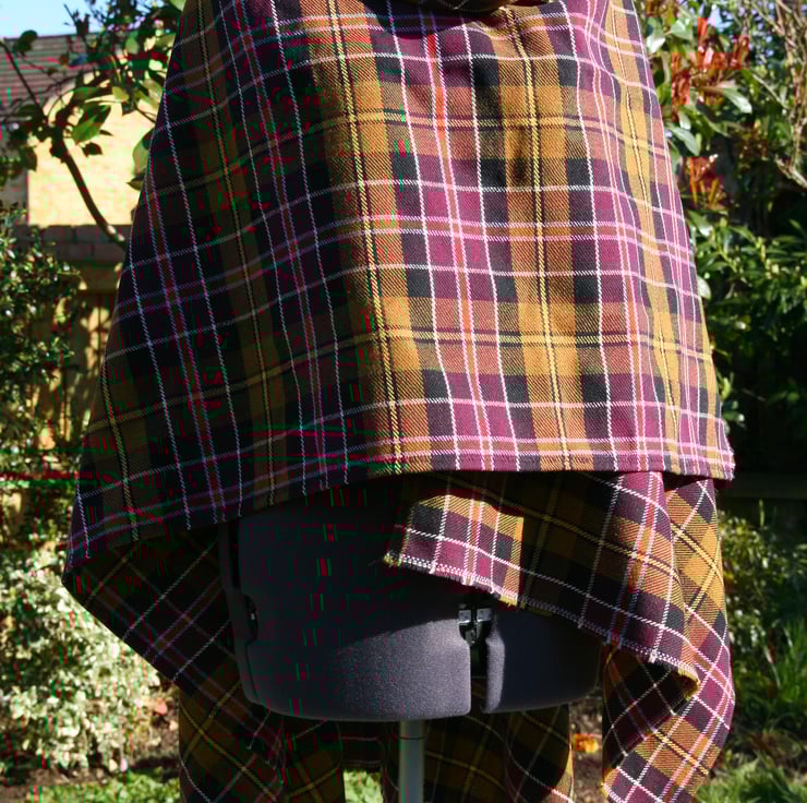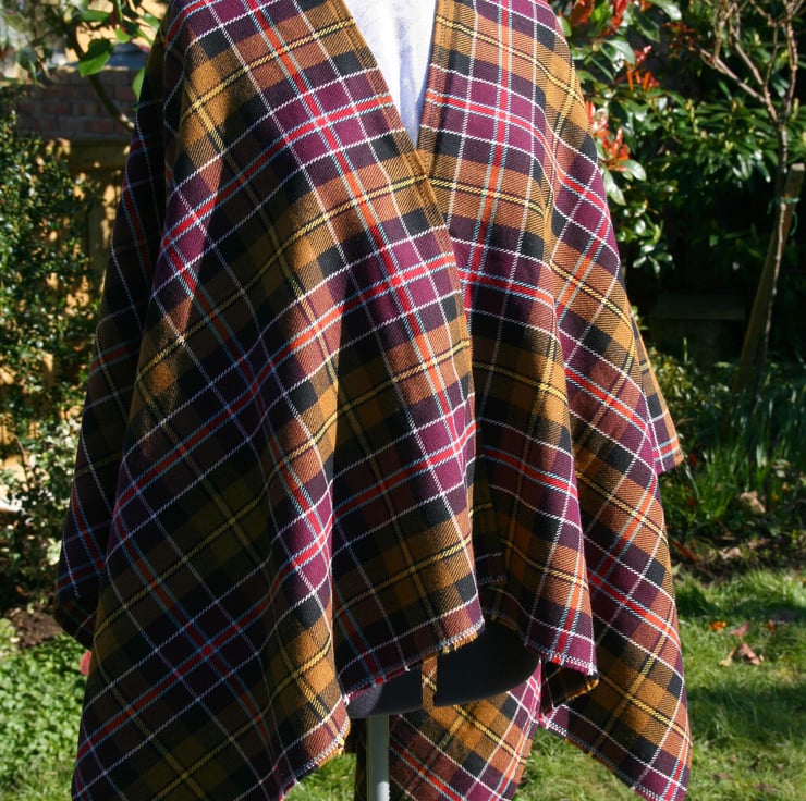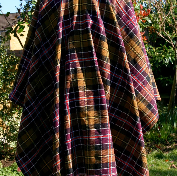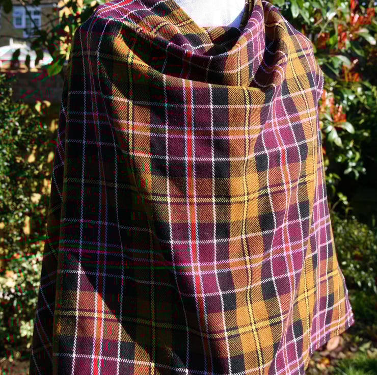This beautiful, tartan shawl, in autumn shades, with flashes of red and blue, will mix and match with your winter wardrobe. It is a one off and would be totally unique to you. Total measurements, one size fits all - 149cm x 124cm. (Washable)