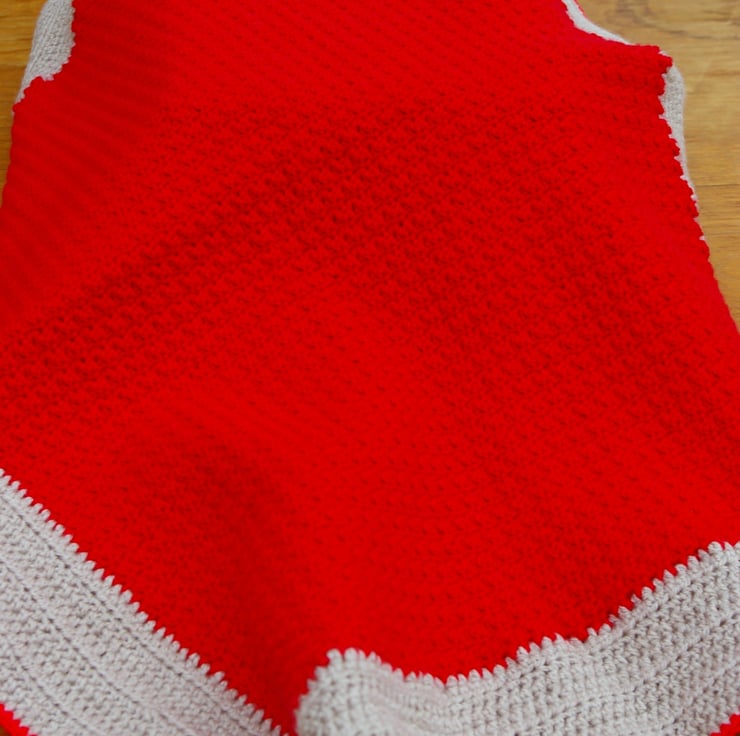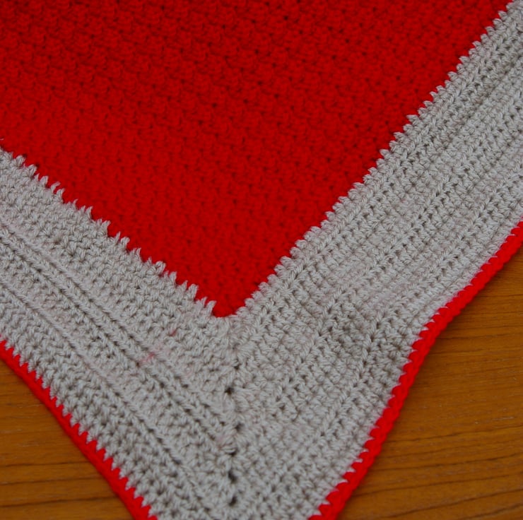 I had been asked to knit a blanket in red and dark brown for a new baby once I had completed it remembered I had more red yarn and some light brown yarn. I laid them together and thought they would look well together. I decided this time to use crochet rather than knitting and after playing around with my hook and yarn I came up with this lovely little blanket.