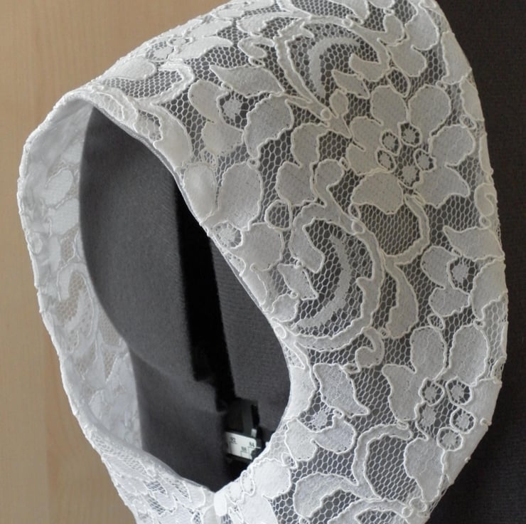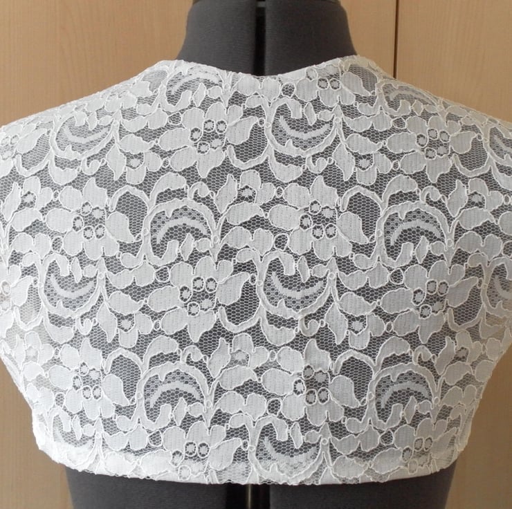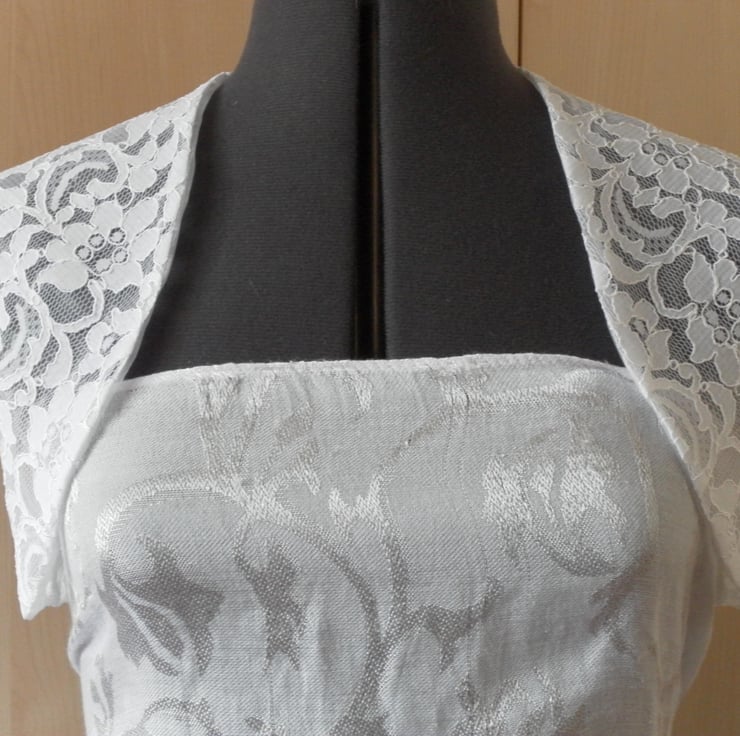 This beautiful, bridal bolero or shrug is handmade by me. It is a one off and would be unique to you. The fabric is a white floral lace, lined with sheer white organza.
