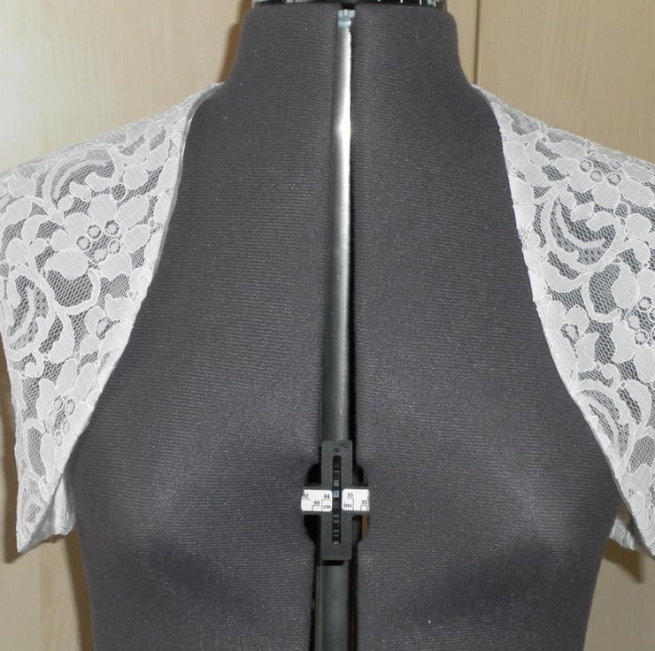 It is a size 10-12, the measurements are neck to bottom of bolero 25 cm and across the back under the arms 47cm. See my matching bridal bag and ring bearer pillow in my shop.