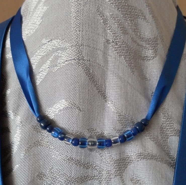 Necklace - blue and clear beads on a blue satin ribbon. Wear as a long necklace or choker.