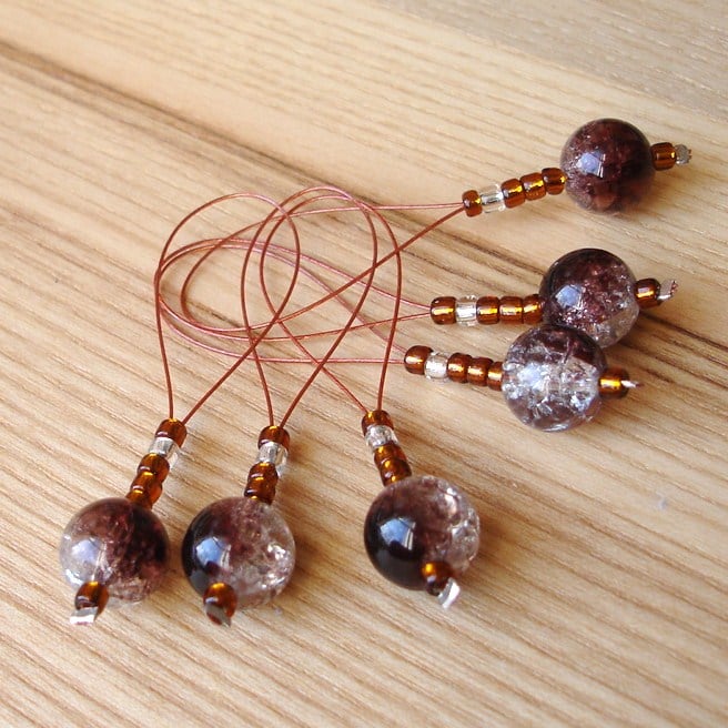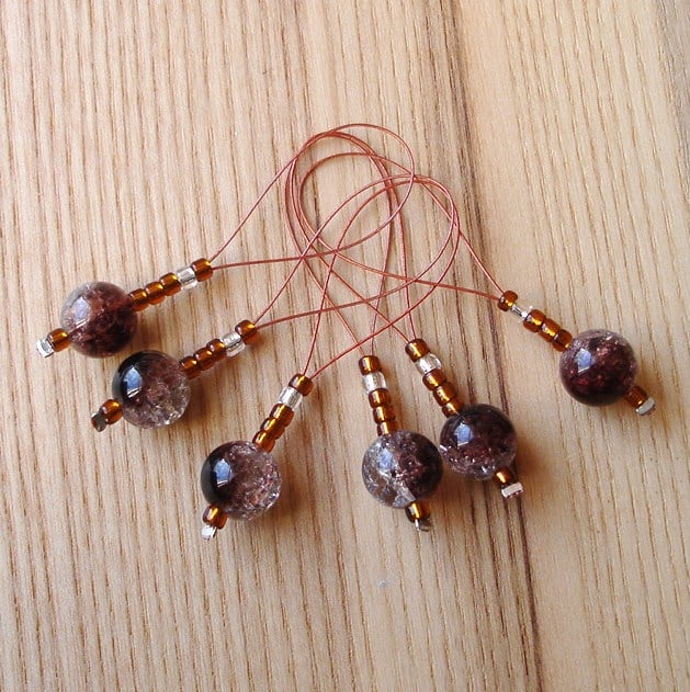 Keep track of your stitches with this set of six stitch markers, even when knitting with extra chunky wool and huge needles. Perfect for avid knitters and comprising beaded drops - a brown crackle glass bead with glass seed beads. Made to fit needles up to approximately 15mm but are just fine for smaller needles.