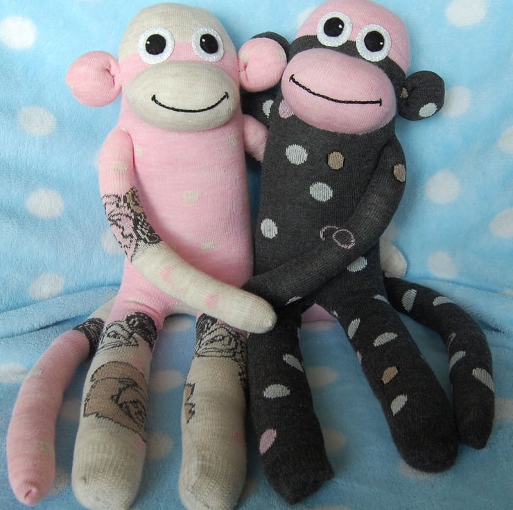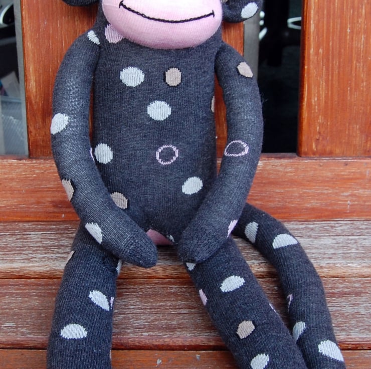 Giles is a cute soft monkey toy made from brand new socks and filled with polyester fibrefill conforming to EN71, CE marked and safe for babies, children and adults too!