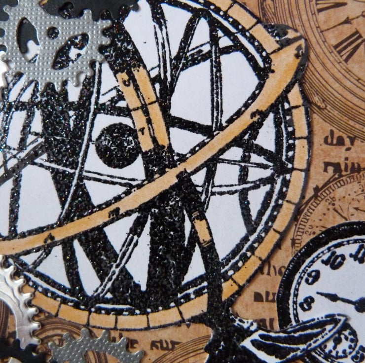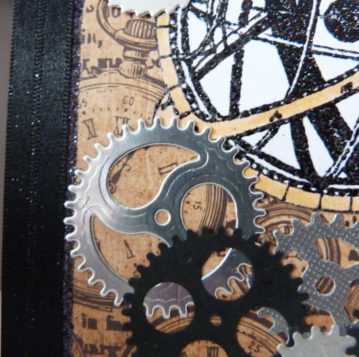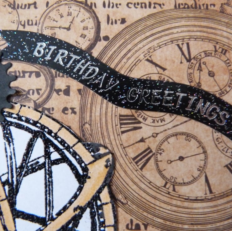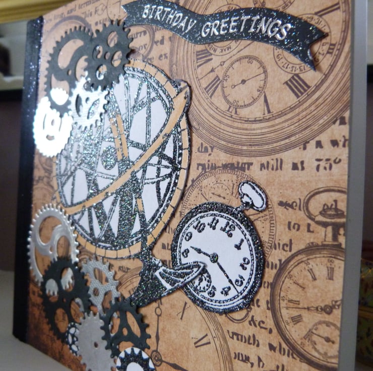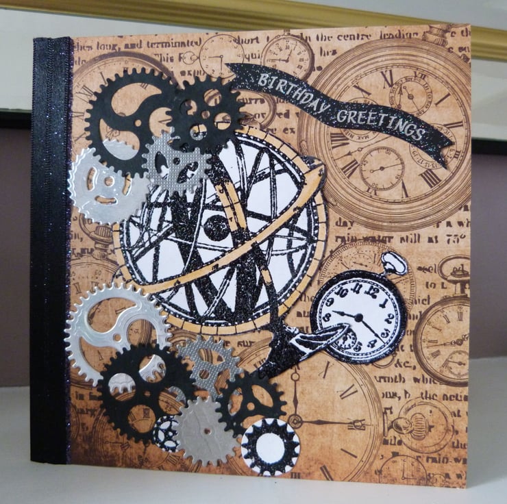 An assortment of clocks, timepieces, cogs and things die cut and stamped and embossed from silver, black, grey card and mounted onto an interesting orange coloured clock paper. All then mounted onto quality white card. Finished off with black ribbon and a birthday greetings black banner.