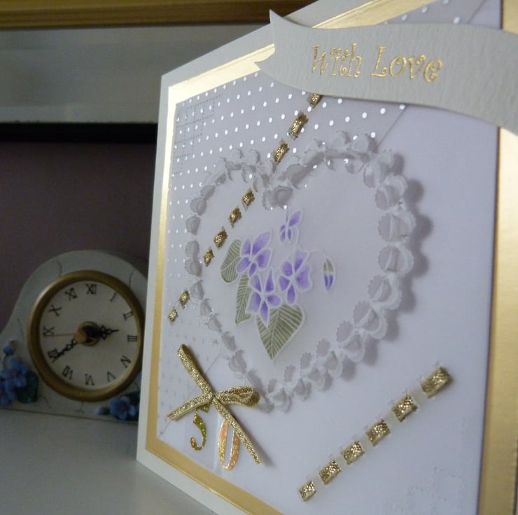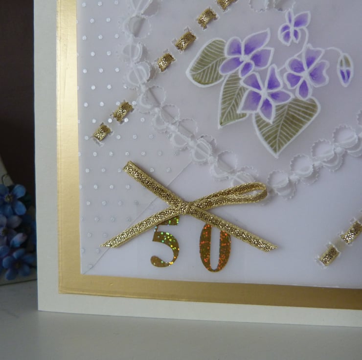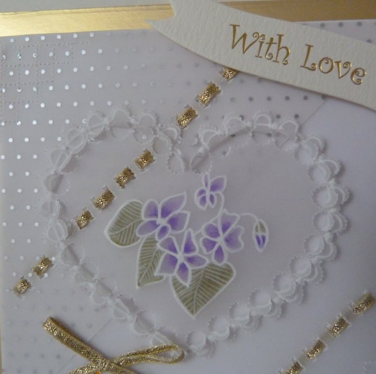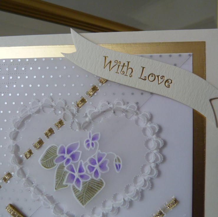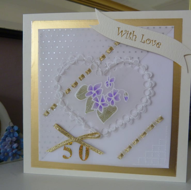A pretty heart which has been embossed, pierced and cut from parchment, mounted onto silver dot patterned vellum and then onto pierced vellum and then mounted onto gold card and then onto cream quality card. The heart has a design of a sprig of violets to symbolise love embossed and hand coloured. Finished off with gold ribbon which has been threaded through, a bow and the numbers 50 in gold. Finished off with a with love banner