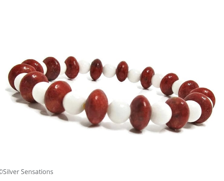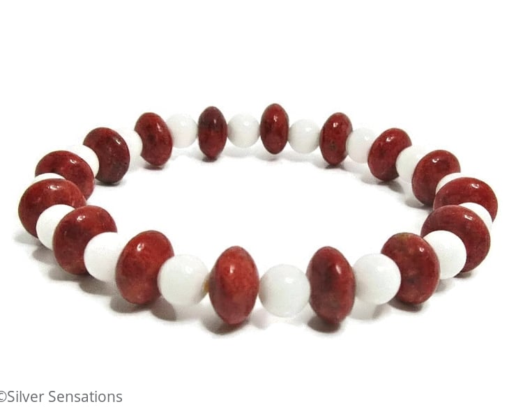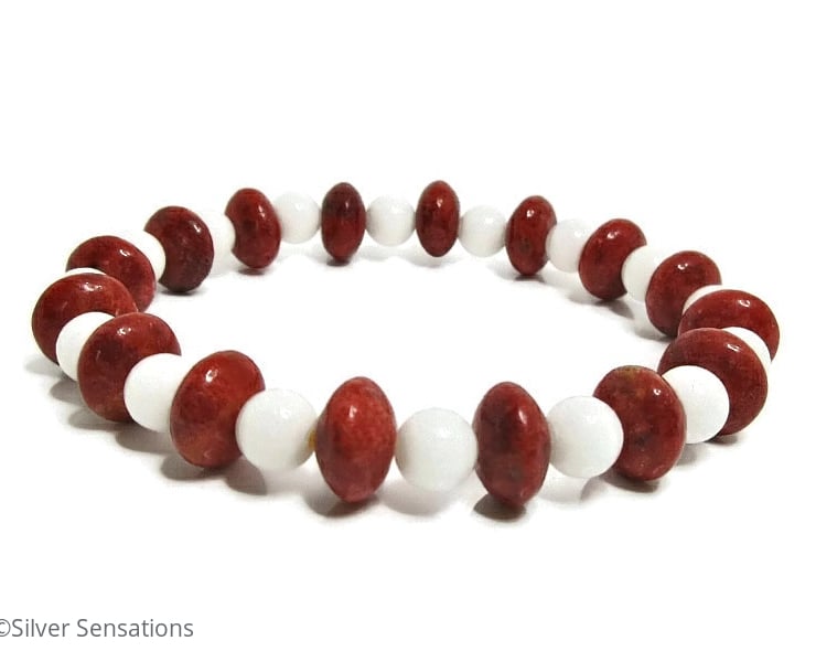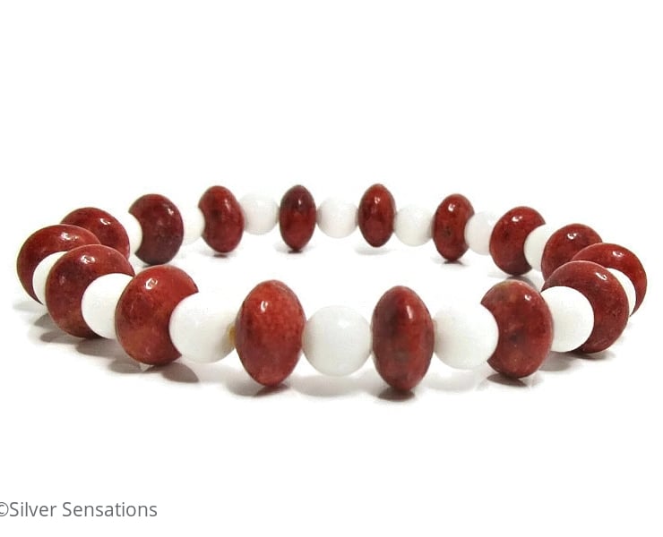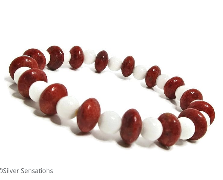 This striking stretch bracelet has been hand made using 6mm Snow White Agate round beads with 10mm x 5mm Red Sponge Coral rondelle beads in between.