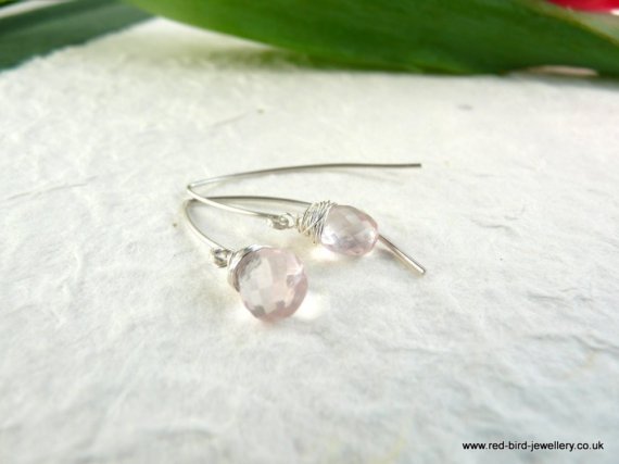 Gorgeous little rose quartz facetted briolettes (8.5mm) are wrapped in sterling silver and hang from an elegant (and just a little bit different) curved sterling silver ear wire.