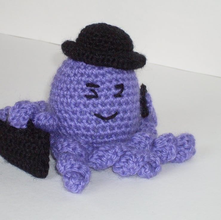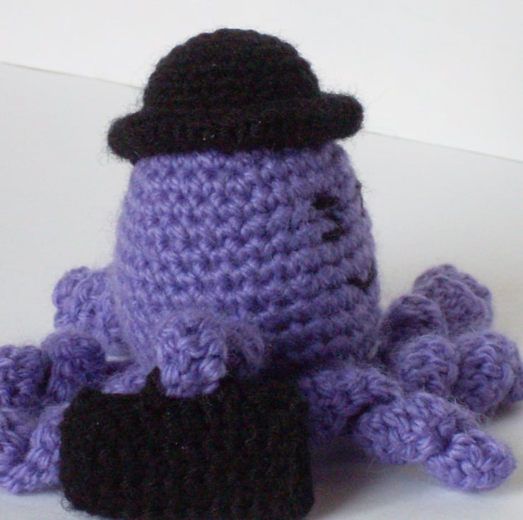 I started making plain octopi to sell at the local Country Market and also make tiny ones. This one somehow called out for a bowler hat and a brief case!