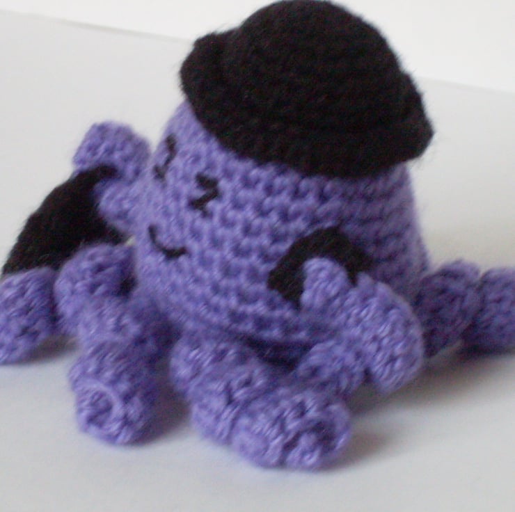Bernie is crocheted from purple yarn and is approximately 7cm (3") high and 5cm (2") diameter. Bernie's tentacles make him approximately 14cm (5.5") across.