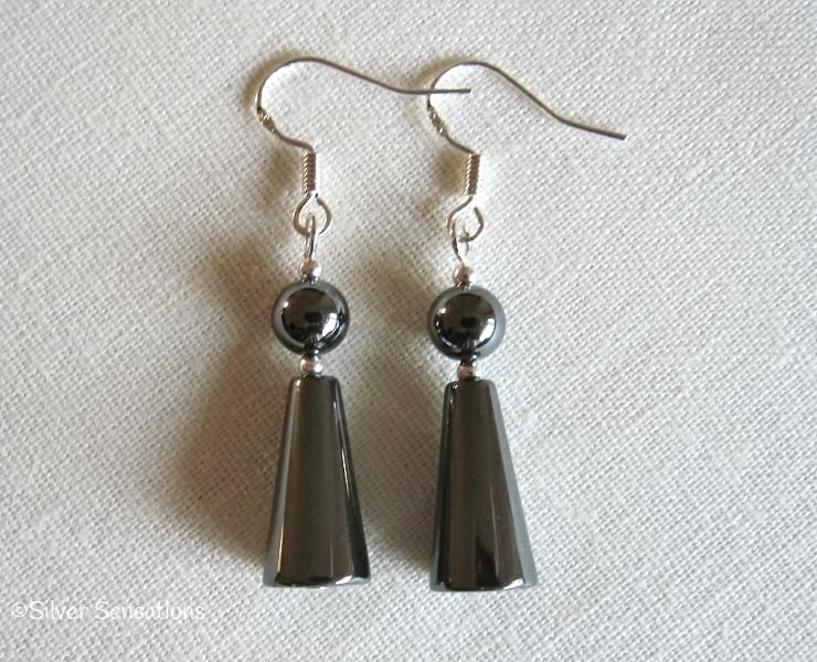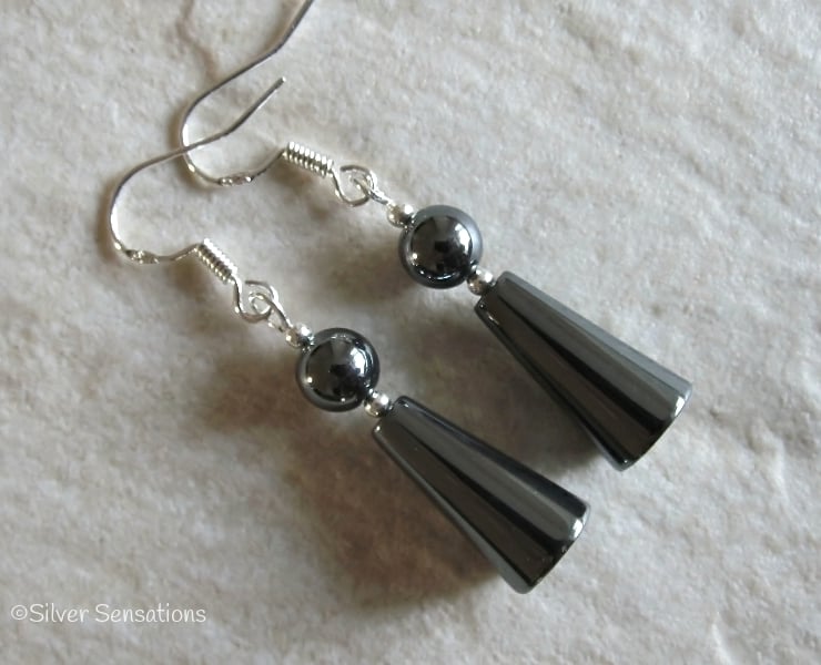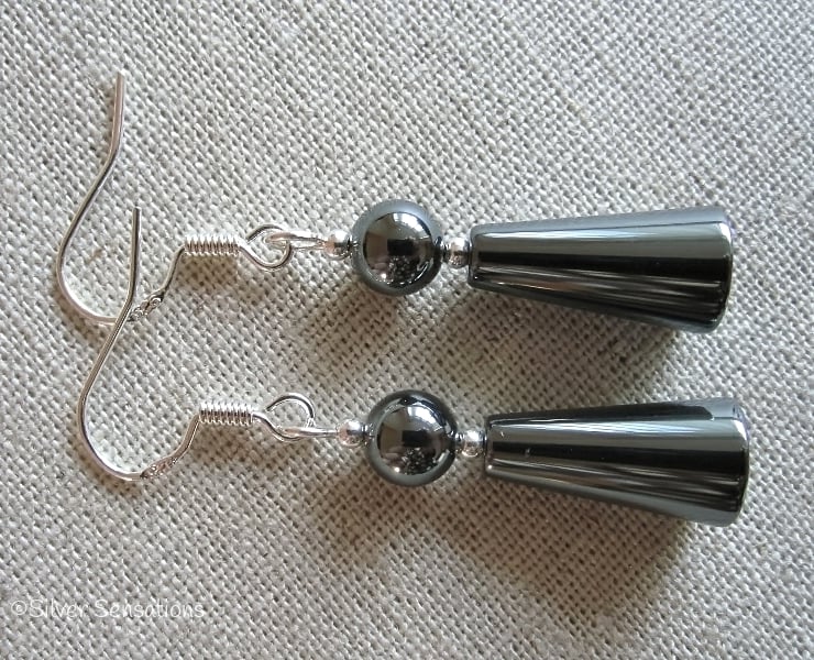 These uniquely designed earrings have gun metal Hematite cone shaped beads with matching round beads & Sterling Silver beads.