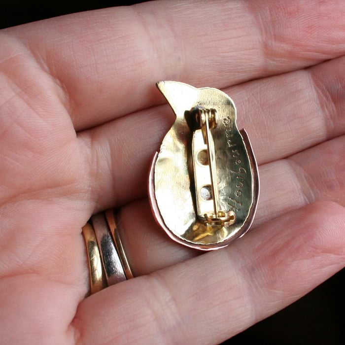 It is about 3 cms or 1.25 inches tall,and has a safety catch soldered to the back.
