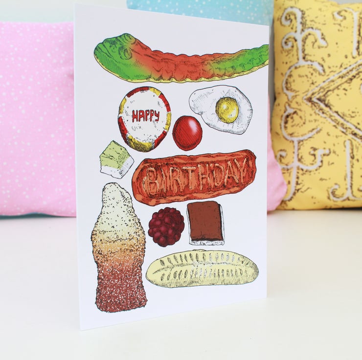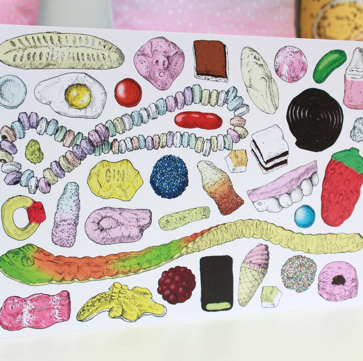 Great for anyone with a sweet tooth, here are some fun and nostalgic greetings card with classic English sweetshop favourites. Using illustrations by Simon Lewis, these detailed drawings have been coloured in digitally to give a bright and colourful visual reminder of all those childhood sweets memories. These cards feature all the best sweets, such as the cola bottle, fried egg, shrimp, banana, teeth, bubblegum bottle, wine gums, jelly bean, white mice........