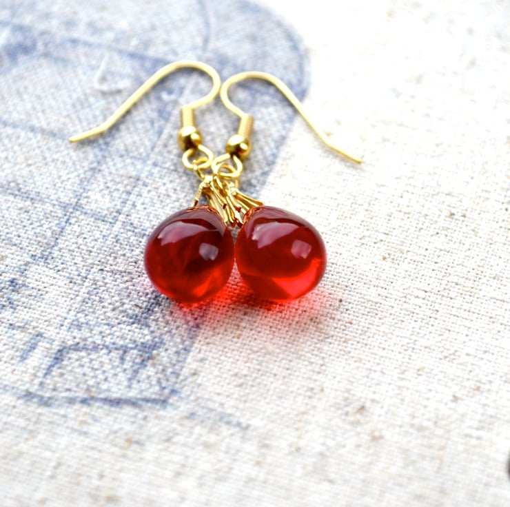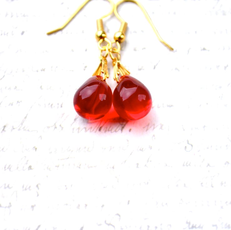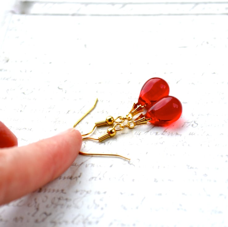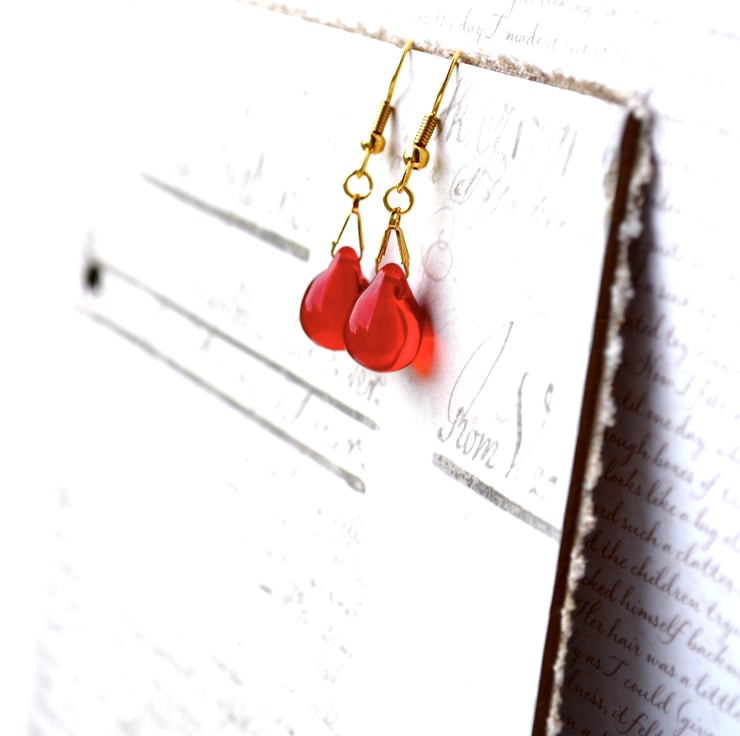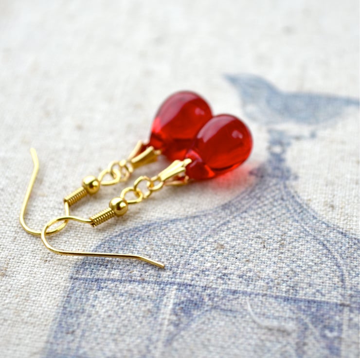 These pretty red bead earrings feature glass teardrop beads in a lovely shade of ruby red, complemented by pretty gold-plated wires. A classic pair of earrings that you will love wearing.