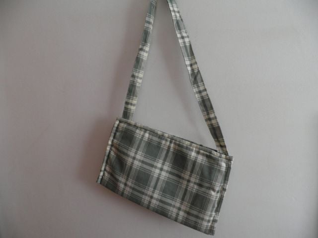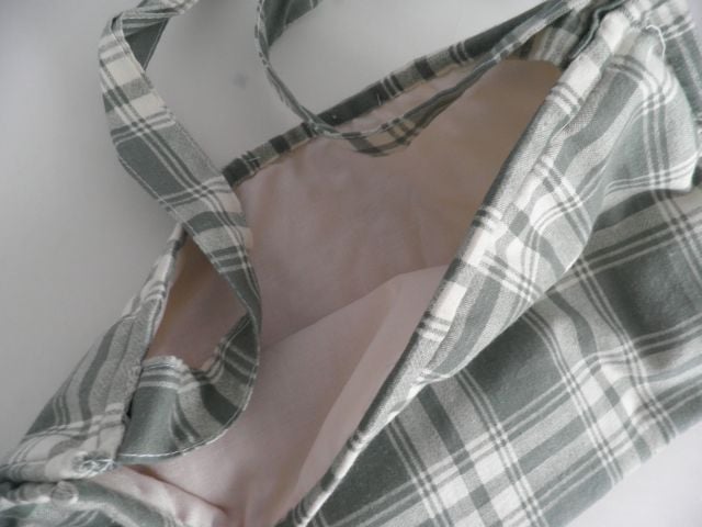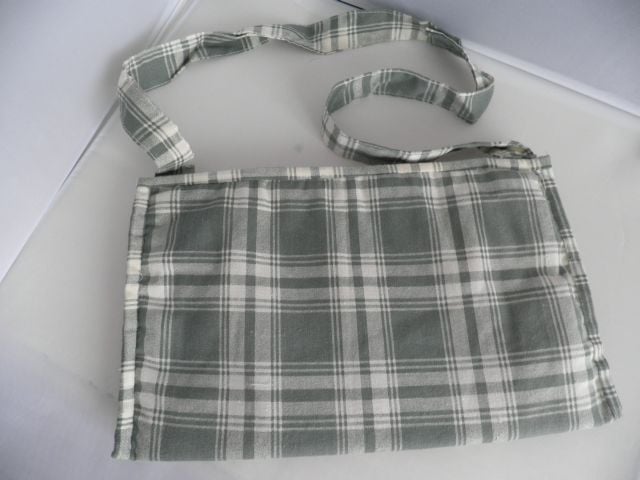 Clothes peg bag measuring approx. 11 x 7 inches, made with green and cream check fabric and lined in cream cotton fabric, it has a long fabric handle which unclips so that you can loop it around your washing line re-fasten and then it is in reach when you are hanging your washing, very useful and practical.