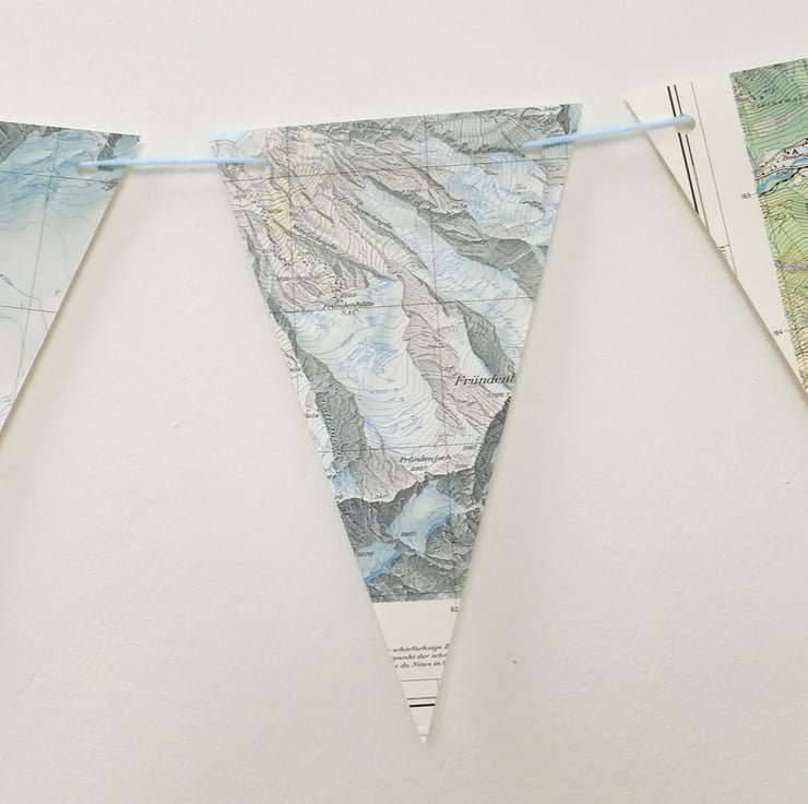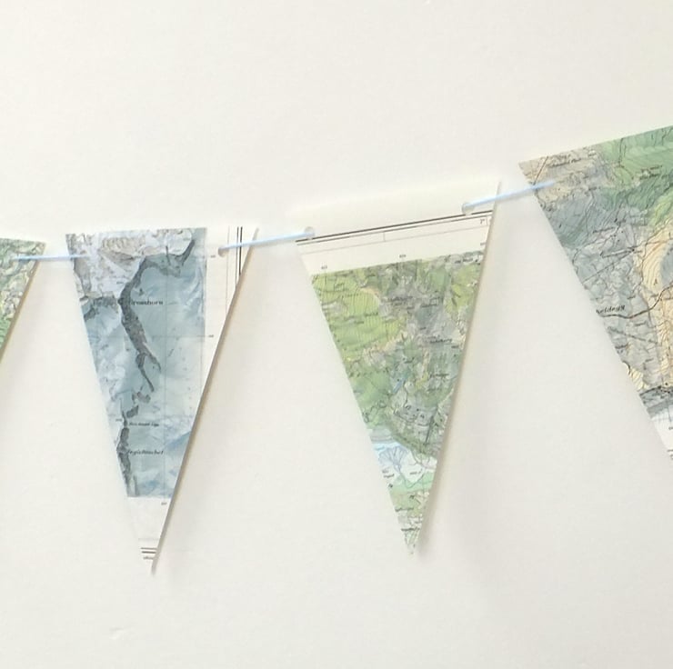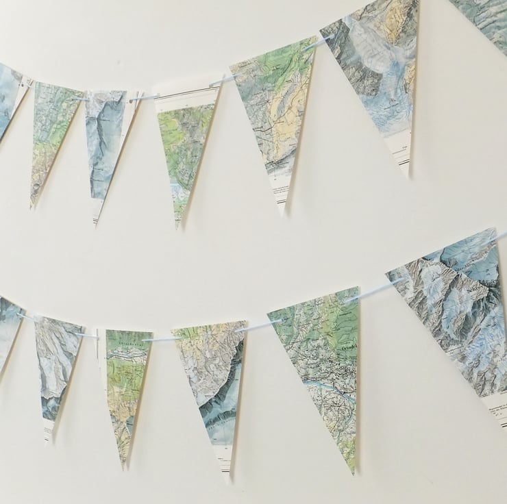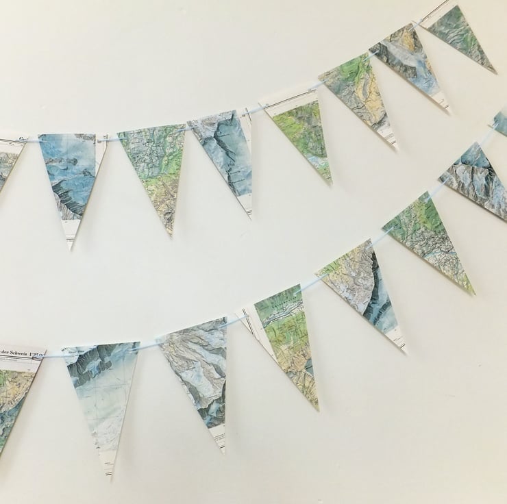 This lovely map bunting is upcycled from a vintage Swiss mountain map for the Alps. This garland would look wonderful in any room and adds a lovely summer feel to your decor!
