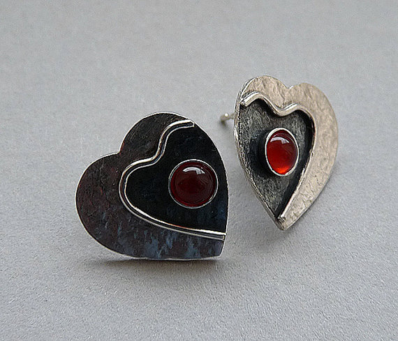 These contemporary heart studs with Carnelian are completely hand made in sterling silver. They have been textured, partially oxidized and polished to a bright and shiny finish. They have sterling silver butterfly backs.