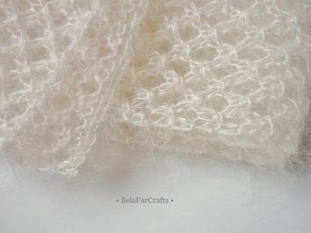 100% natural kid mohair and silk yarn in ivory color. Mohair easily absorbs and releases moisture; it is therefore comfortable to wear in both cold and hot weather.
