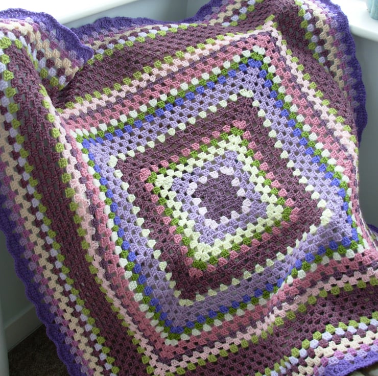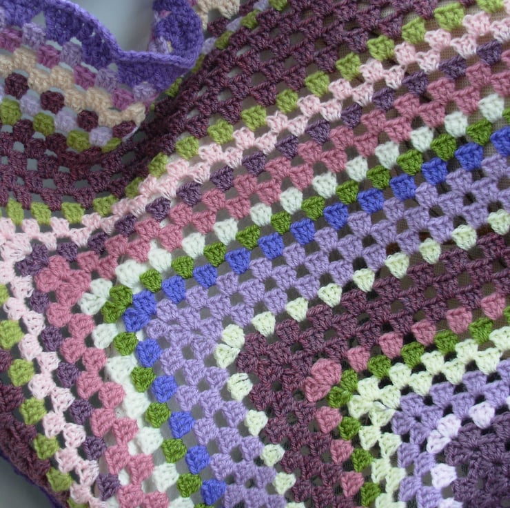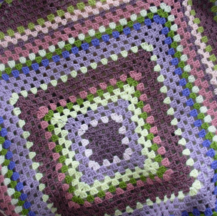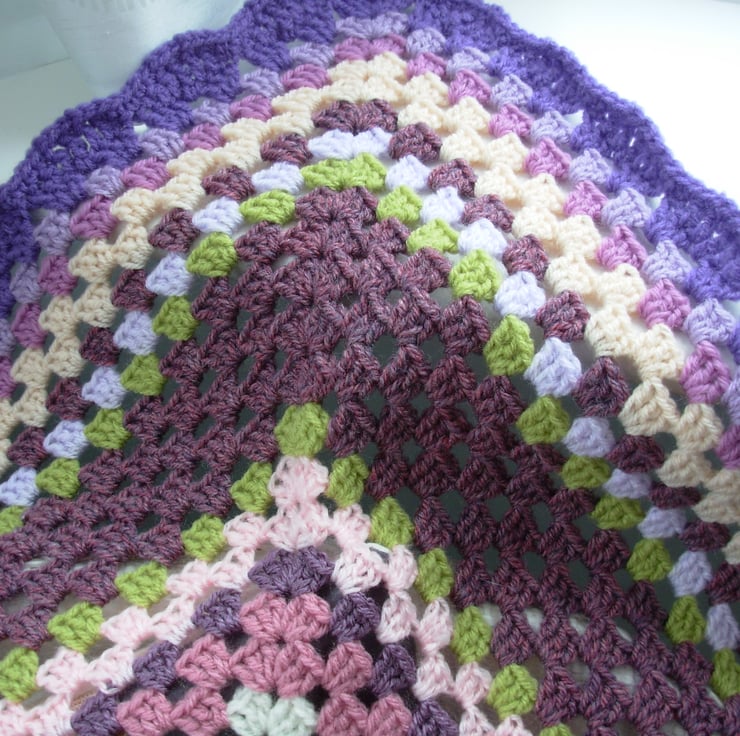 This colourful blanket is crocheted in double knit acrylic yarns in purple, lilac, lavender, pinks, greens, and cream and has a purple scalloped edge. Ideal as a snuggle blanket on the sofa or a throw over the bottom of a bed.